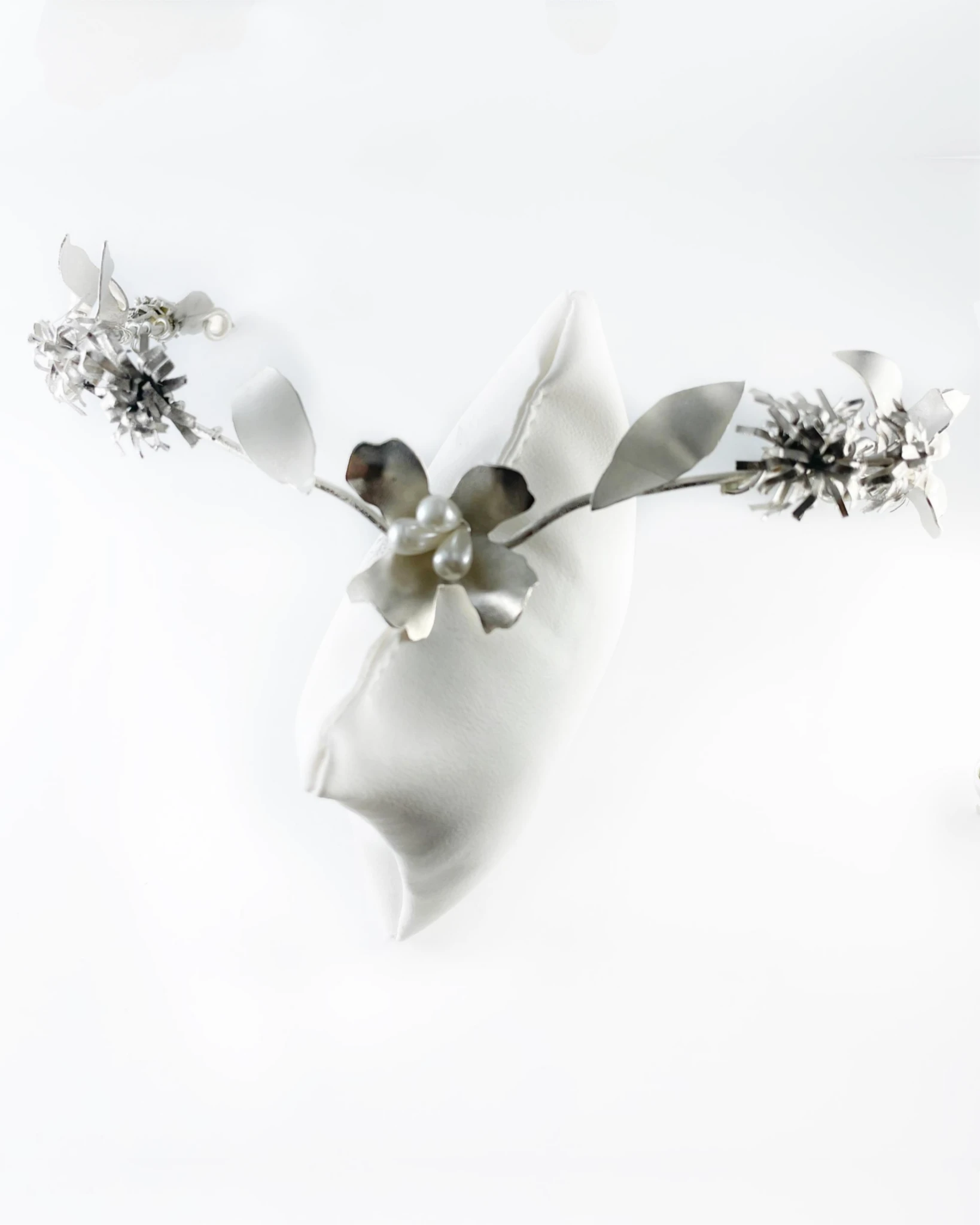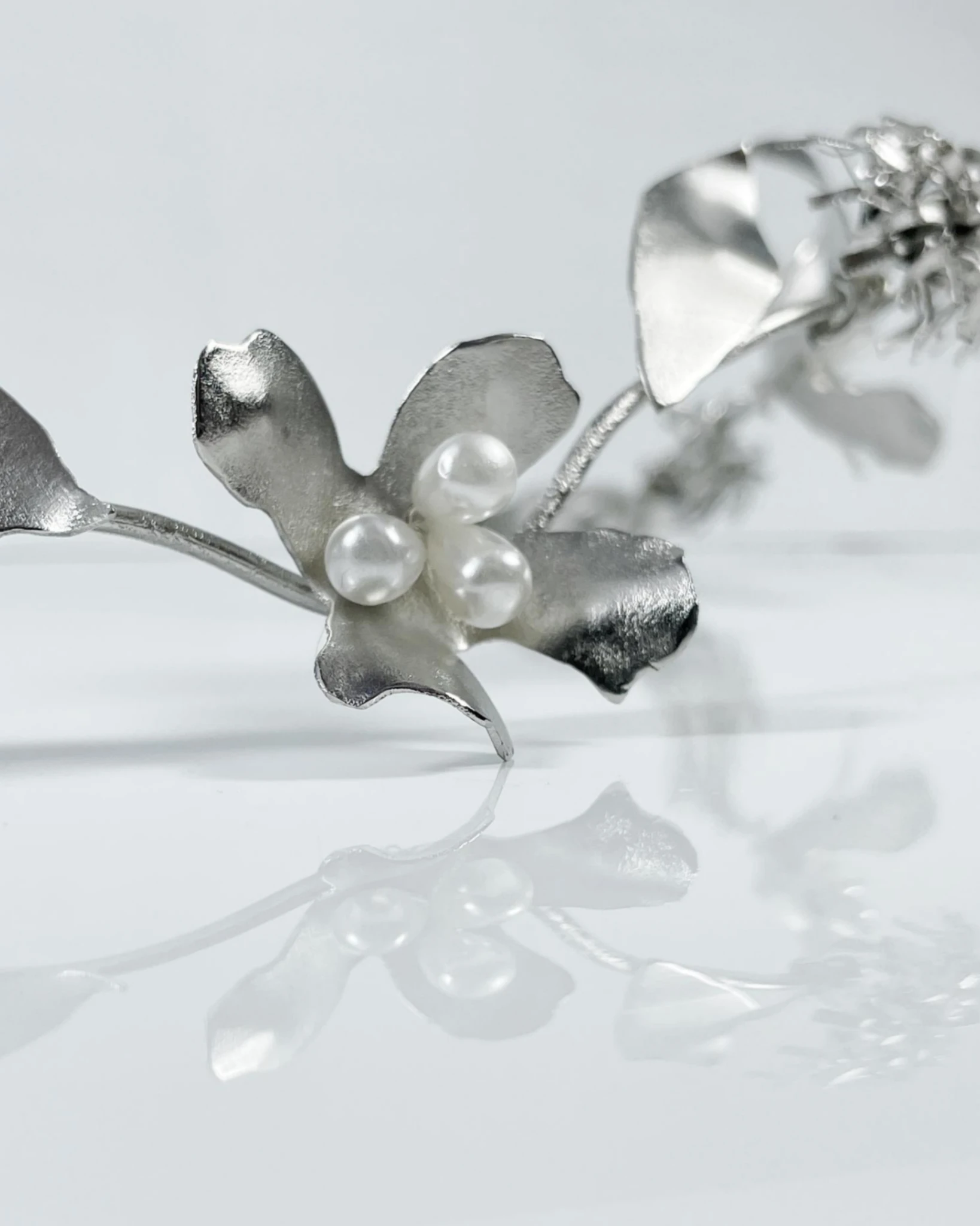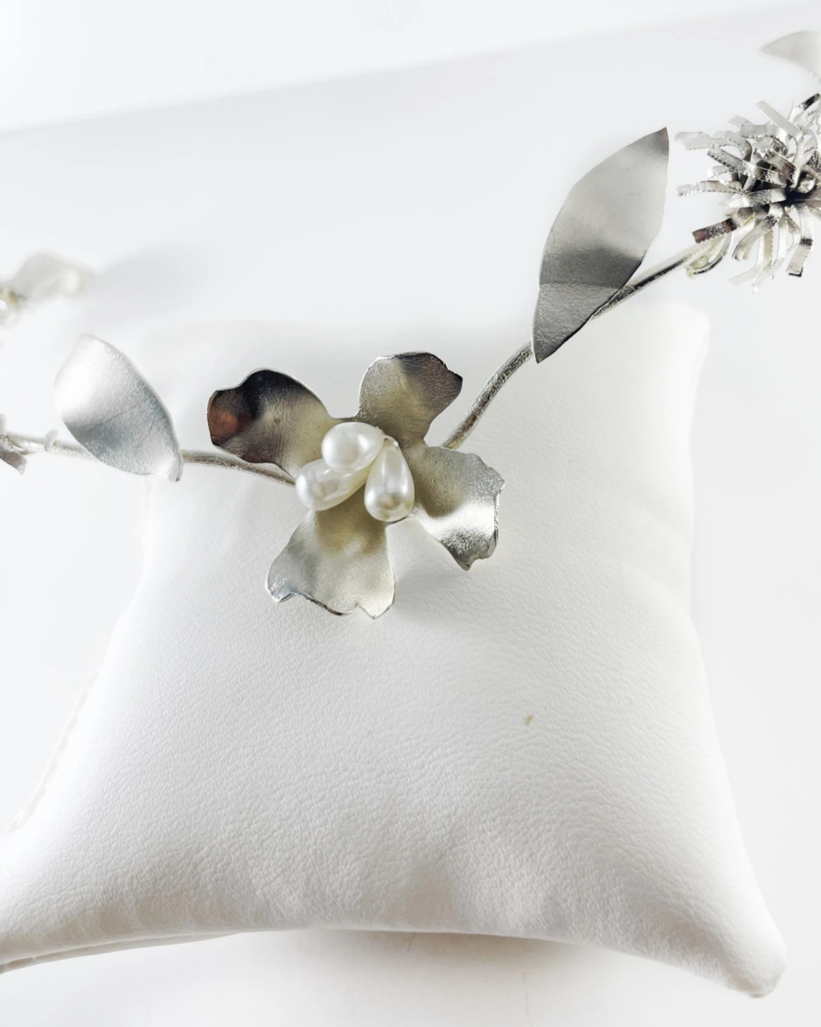 Es un diseño con flores medianas y con el centro en perlas white en forma de gotas Su diseño, está realizado completamente a mano en bronce con flores, hojas y pimpollos fantasia que aportan un aire romántico y delicado.
