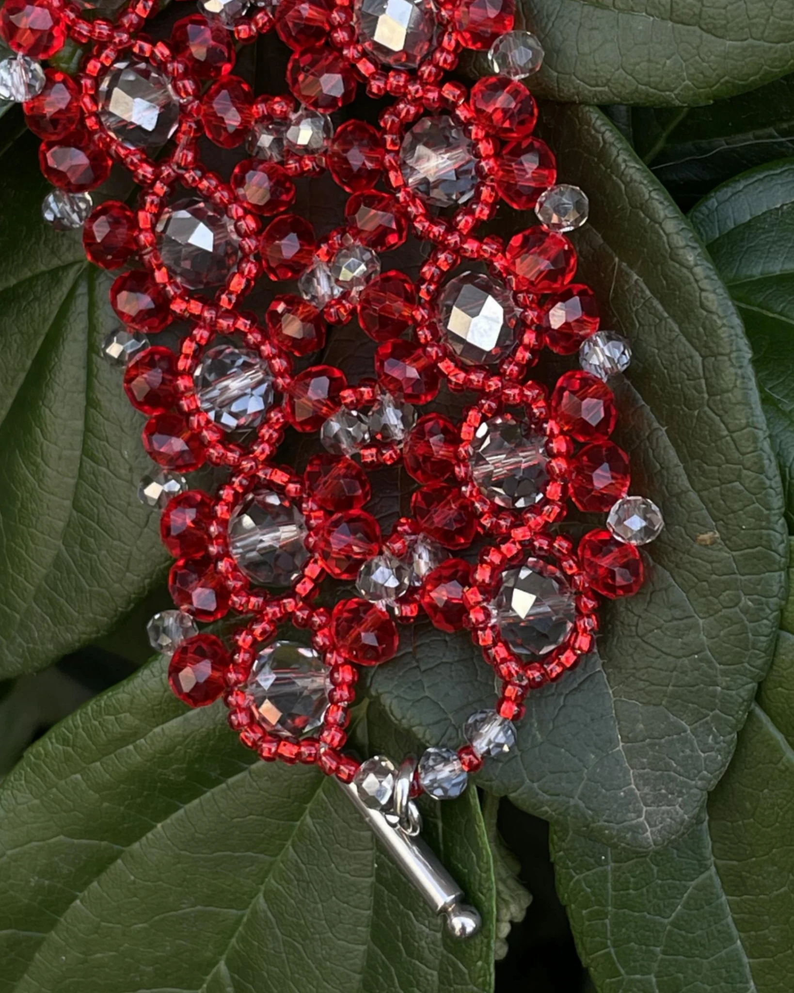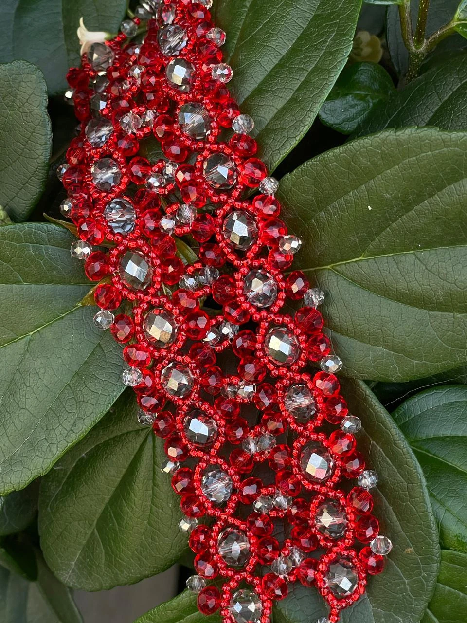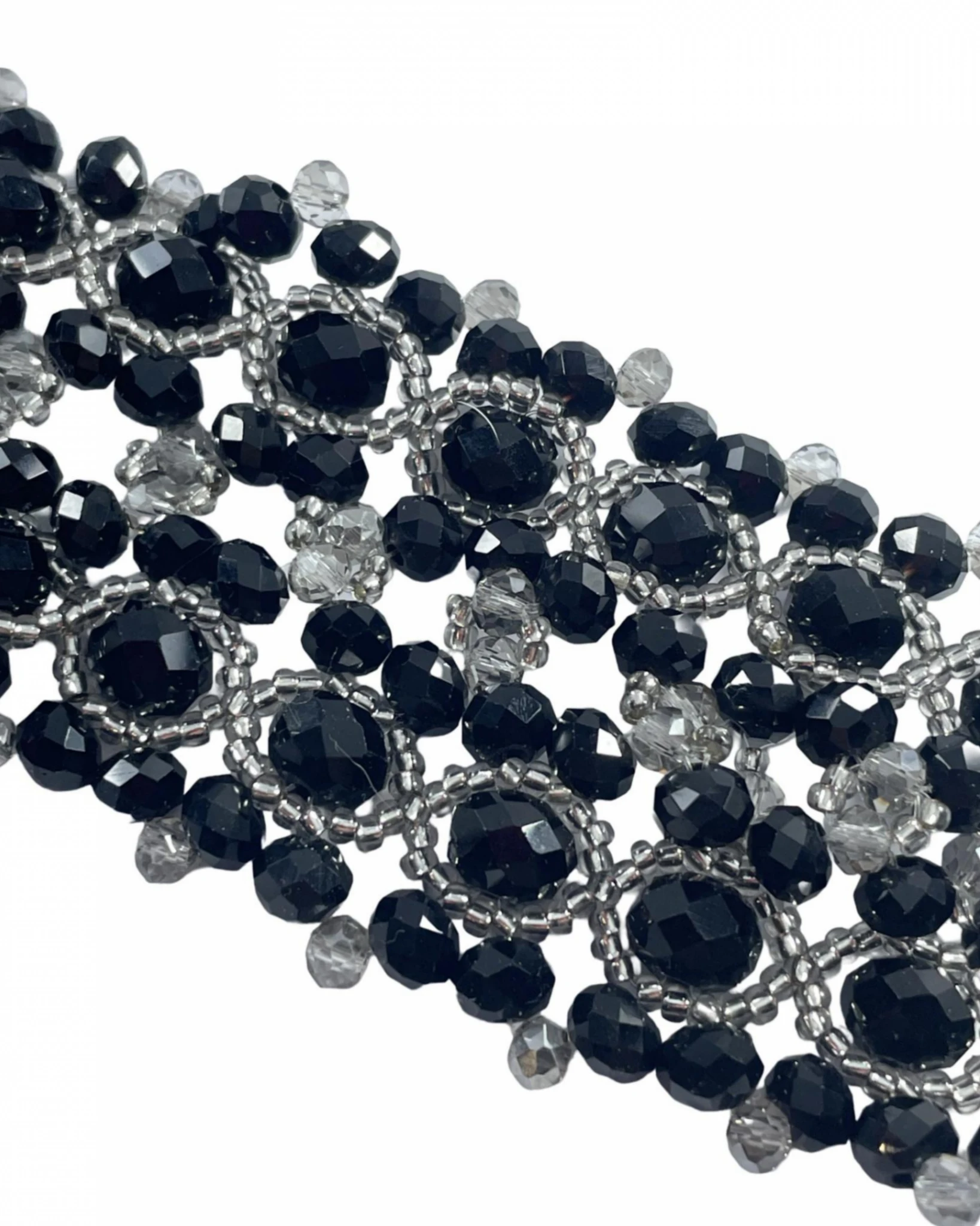 Cada detalle está cuidadosamente trabajado a mano con cristales y mostacillas calibradas, logrando un diseño único que combina distinción y modernidad.