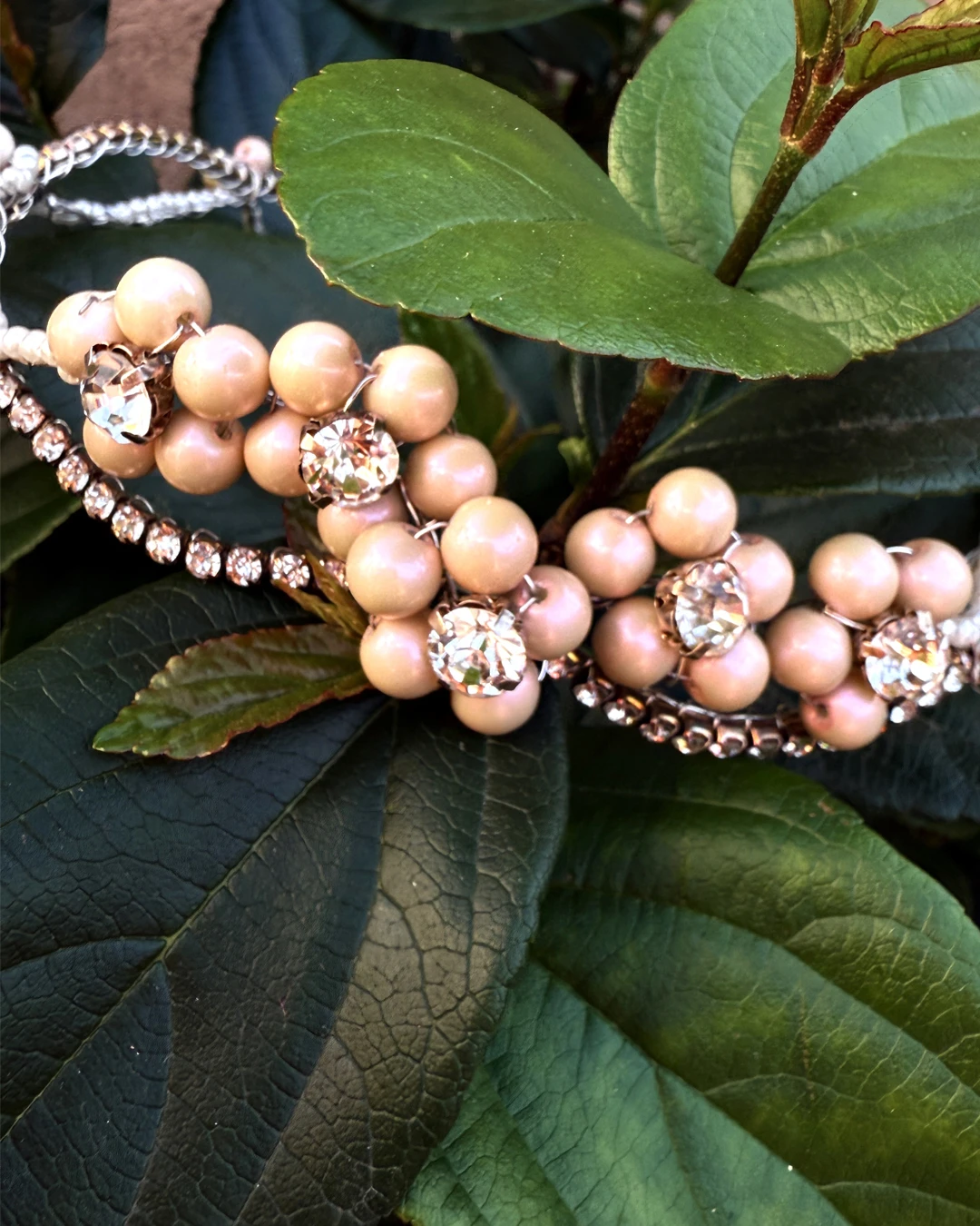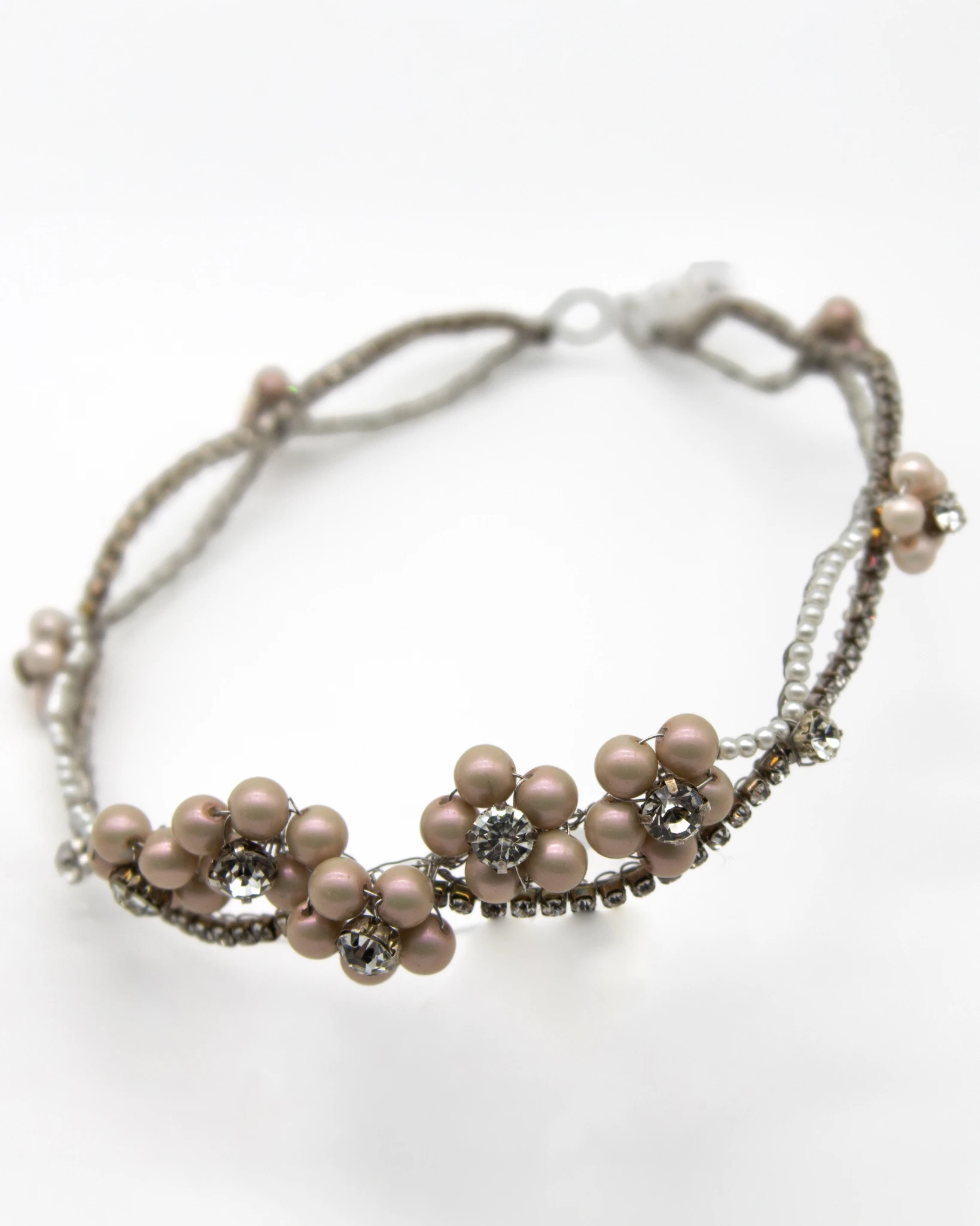 Fue creada a mano con técnica de alambrismo, combinando perlas en tono rose, strass y
