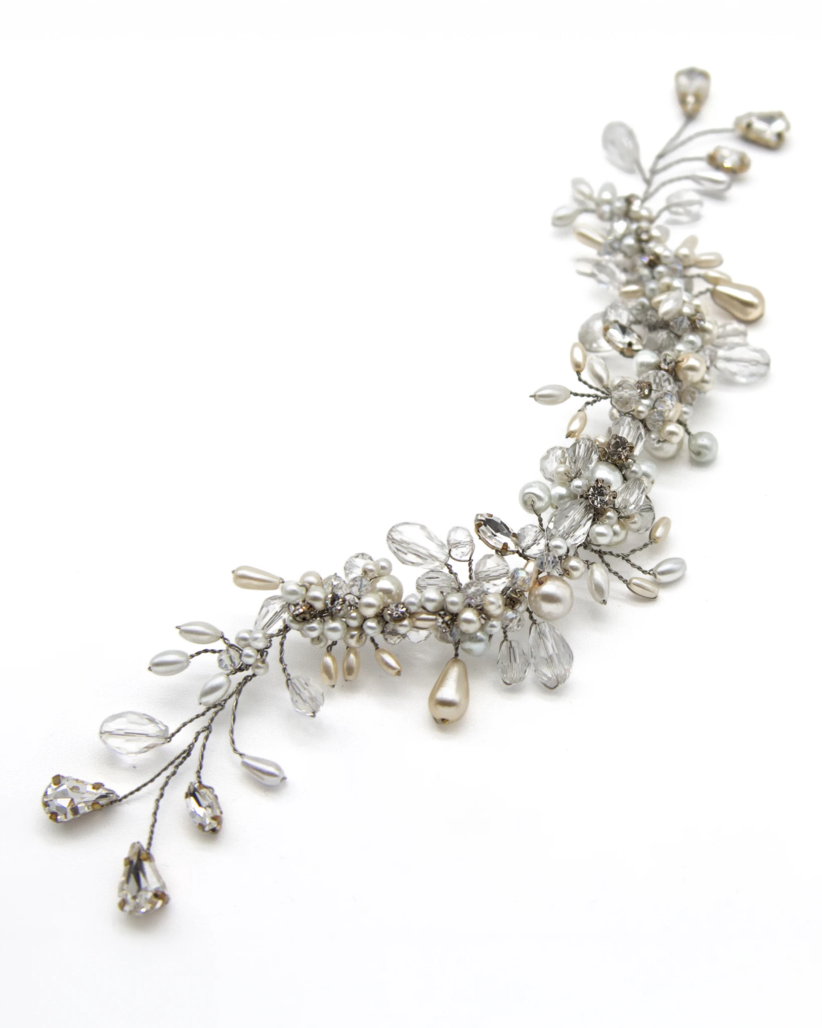 Este tocado fue creado a mano con técnica de alambrismo, combinando perlas white , gotas en strass y cristales checos en tonos white.