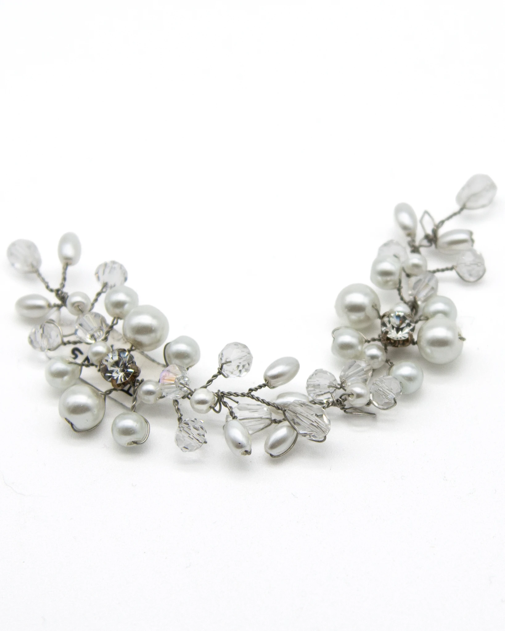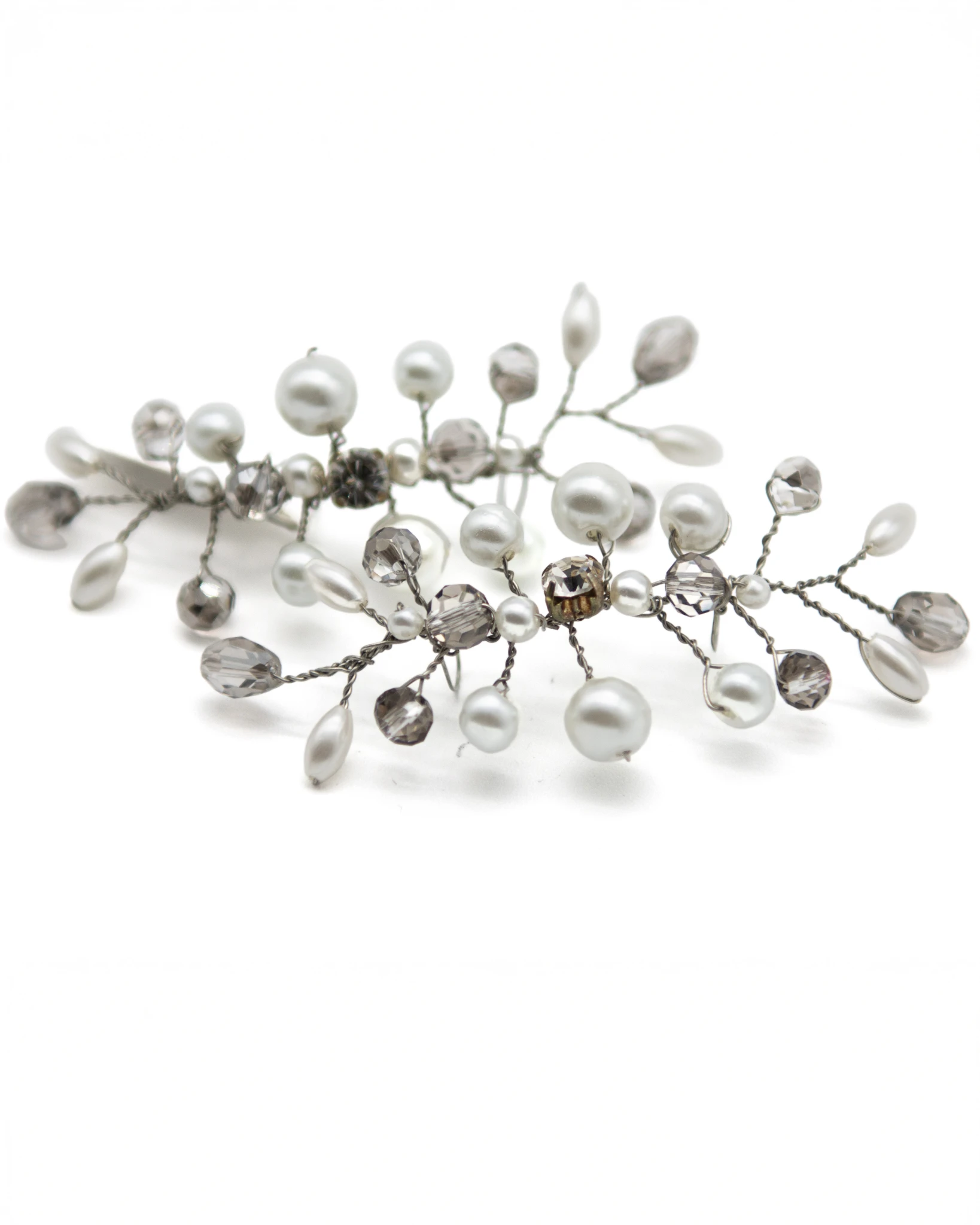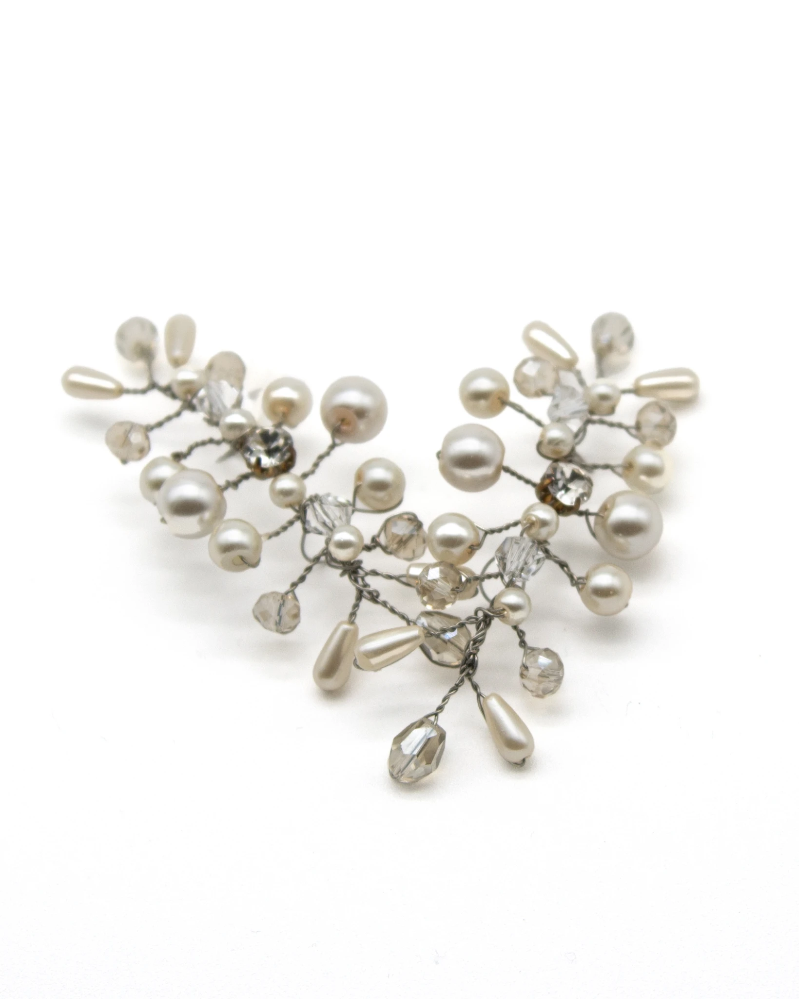 -Tocado muy versatil realizado en dos piezas simétricas, ambas con centro de strass, combinados con perlas en tono white y cristales.