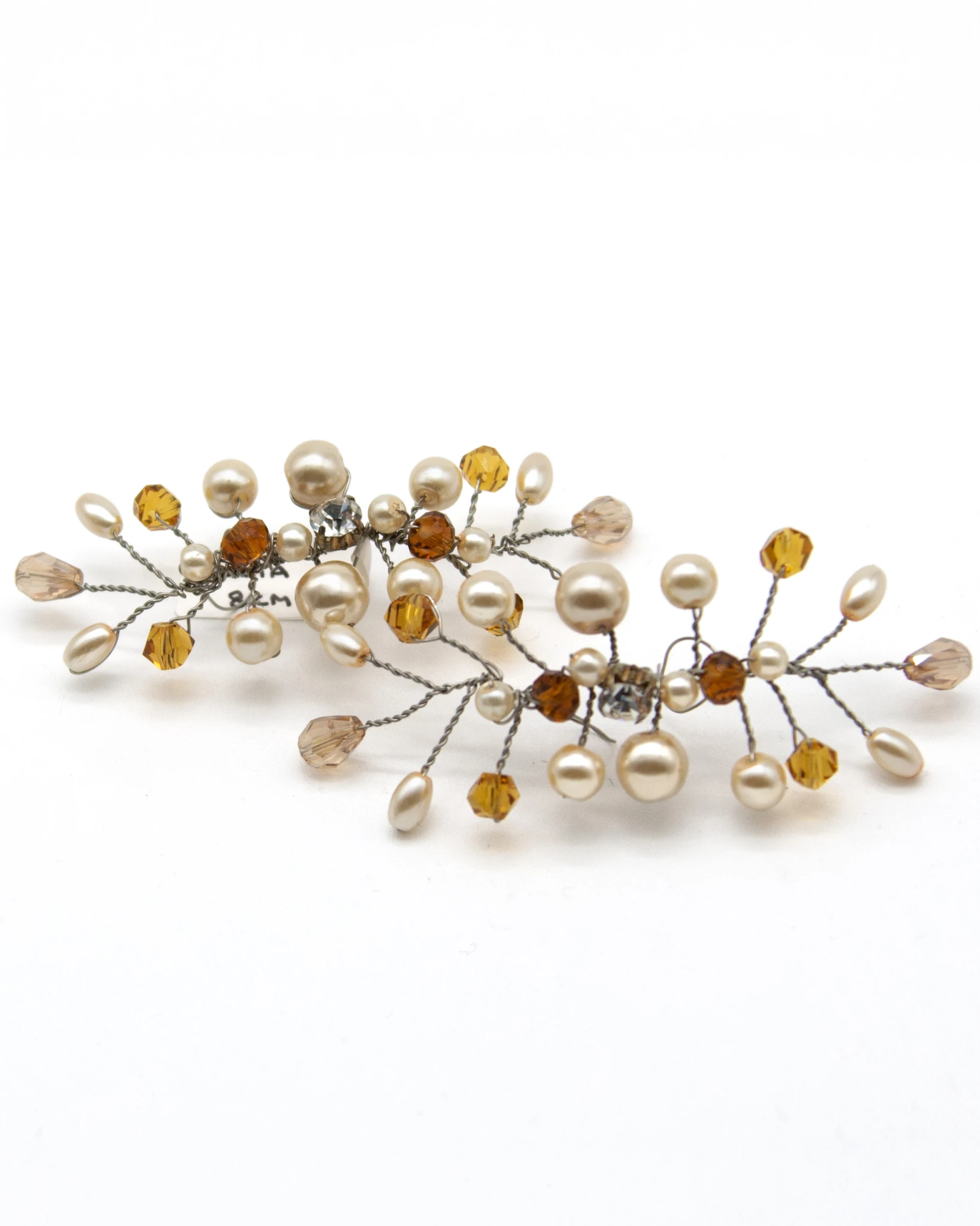 Tocado muy versátil realizado en dos piezas simétricas, ambas con centro de strass, combinados con perlas en tono champagne y cristales copper.