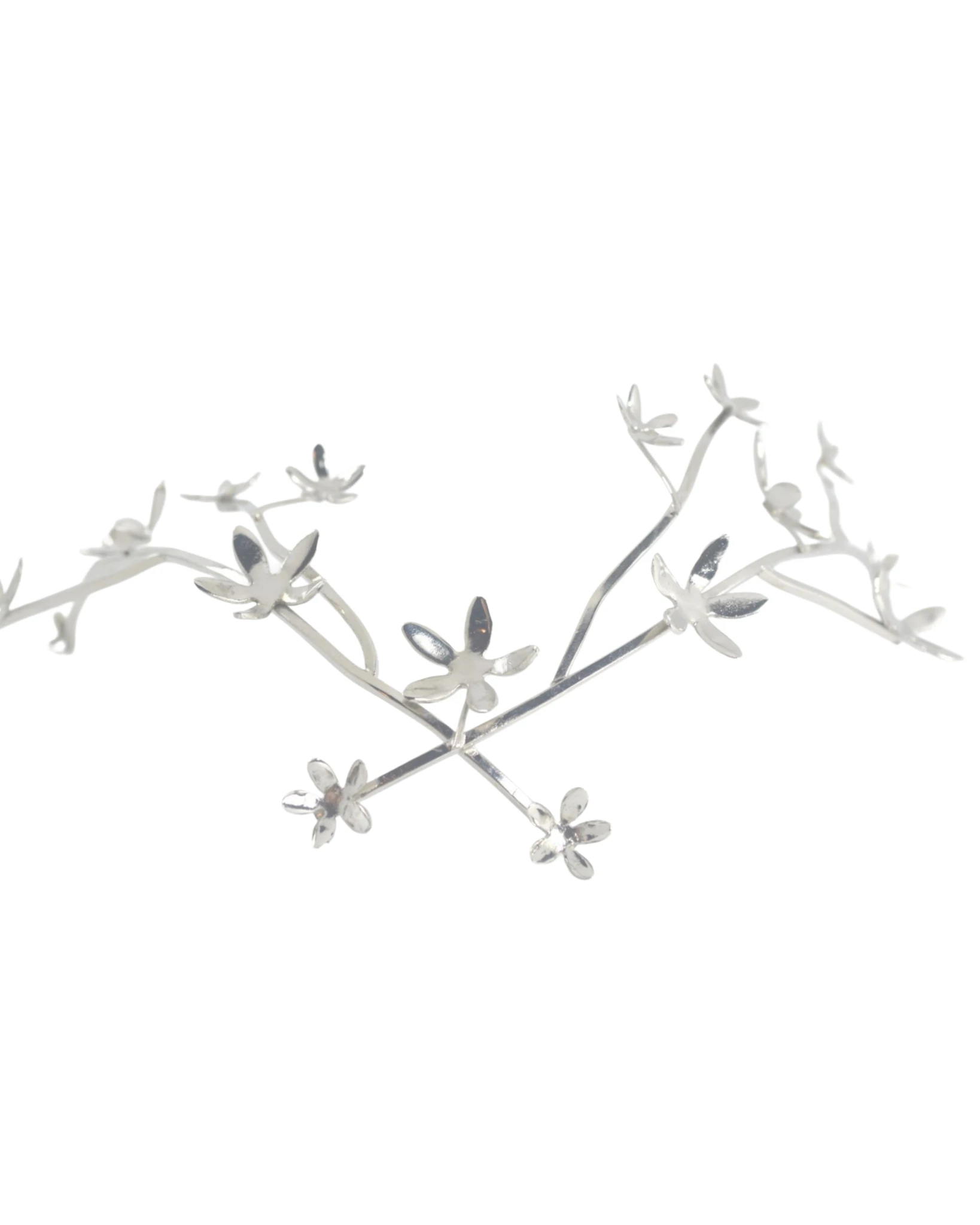 Es una pieza importante pensada para ser protagonista. Su diseño en forma de V, está realizado completamente a mano en bronce con delicadas flores inspiradas en el jazmín del país que aportan un aire romántico y delicado.