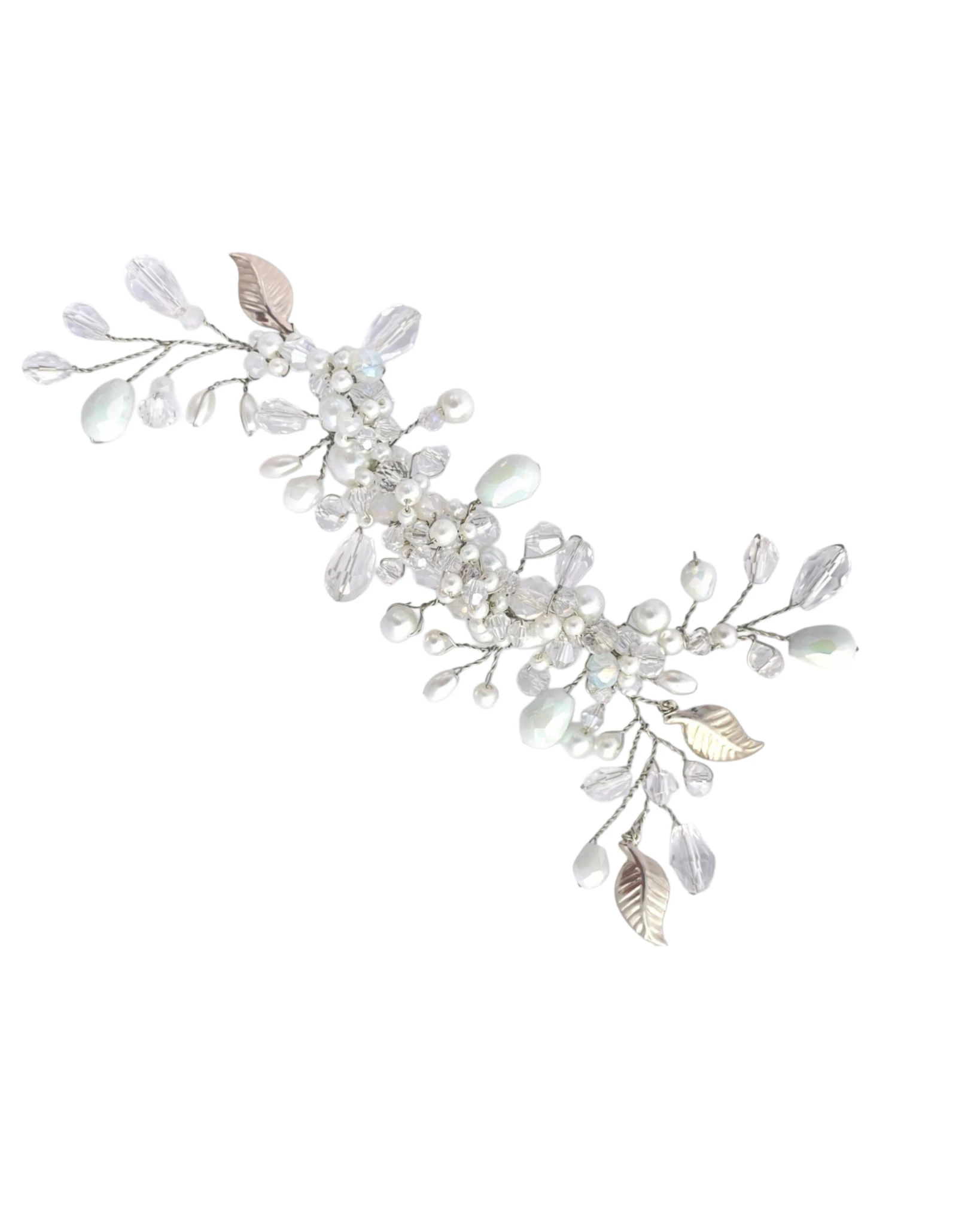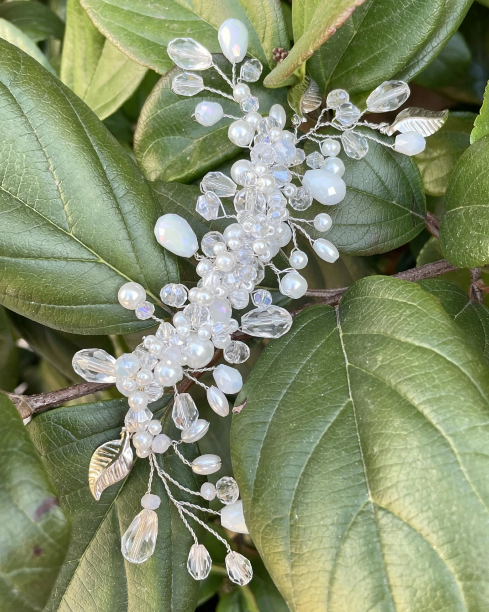Diseño asimétrico hecho a mano con perlas white, cristales checos en tonos cristal y hielo con hojitas metalicas.
