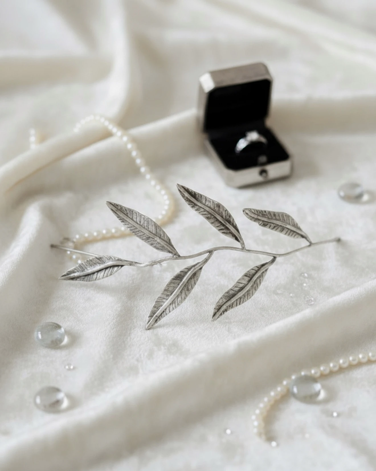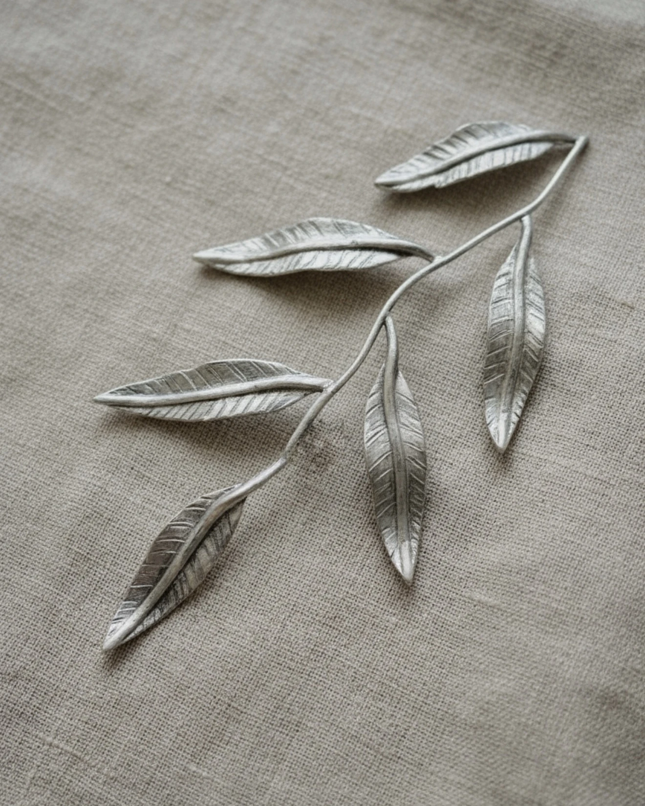 Su diseño orgánico, compuesto por hojas delicadamente modeladas, está pensado para realzar peinados con un toque sofisticado y natural. El acabado final fue realizado con un fino baño en Plata al igual que los aros que completan el look
