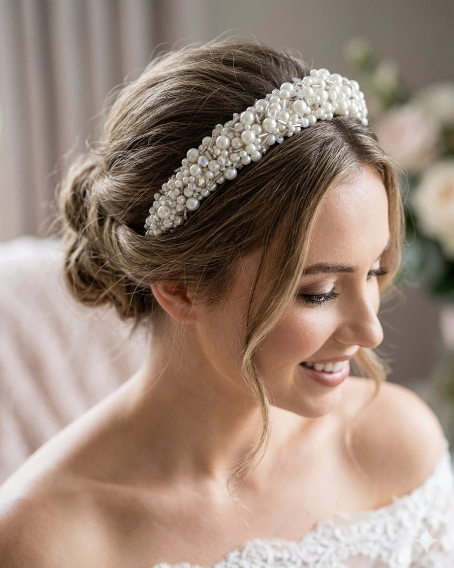 Enmarca el peinado con elegancia y sutileza, ideal para novias o quinceañeras que buscan un detalle especial que acompañe su estilo con luz propia.
