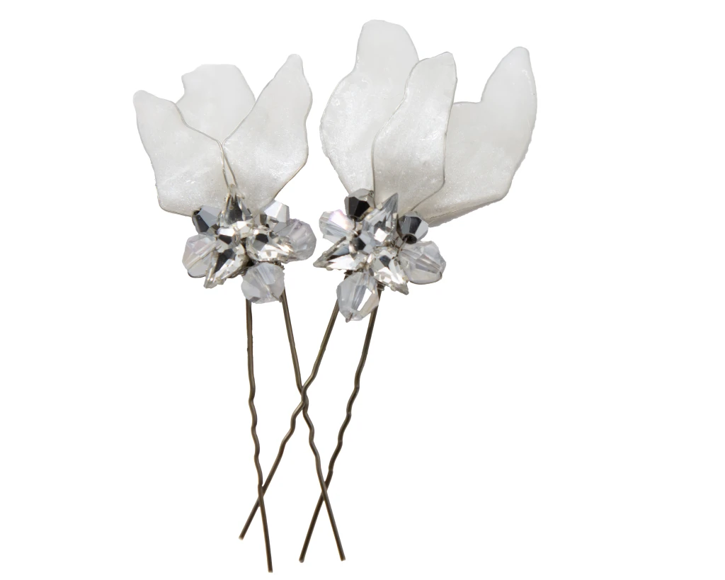 Este tocado fue creado a mano con técnica de alambrismo, combinando hojas esmaltadas en tonos white, cristales checos en tonos white y transparentes y detalle de strass.