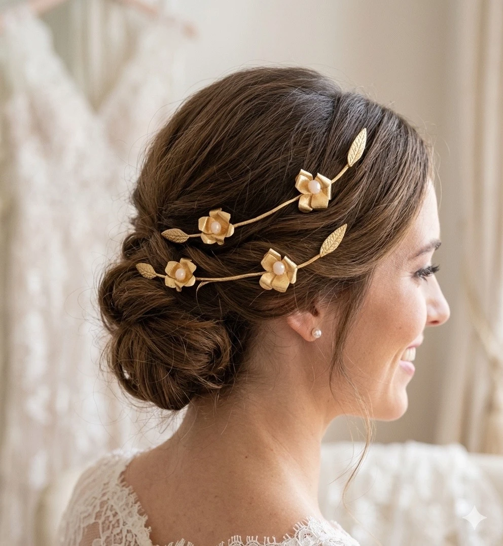 Dos piezas protagonistas. Confeccionado completamente a mano en bronce, combina Flores con centros de crista y hojas. Se que adapta con elegancia a recogidos y semirrecogidos.